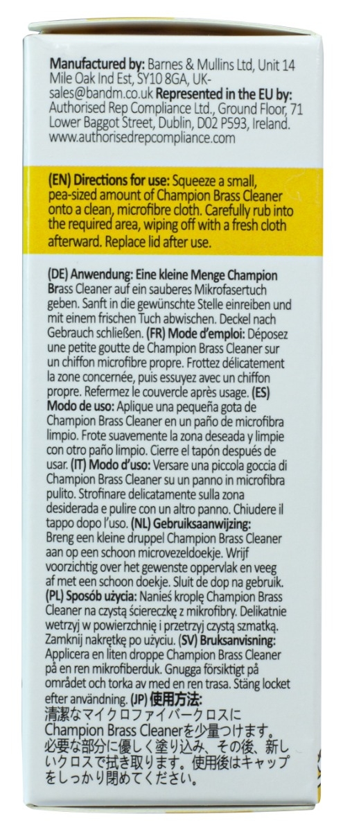 Squeeze a small, pea-sized amount of Champion Brass Cleaner onto a clean, microfibre cloth. Carefully rub into the required area, wiping with a fresh cloth afterward. You will soon see your instrument gleaming once more. Replace lid after use.