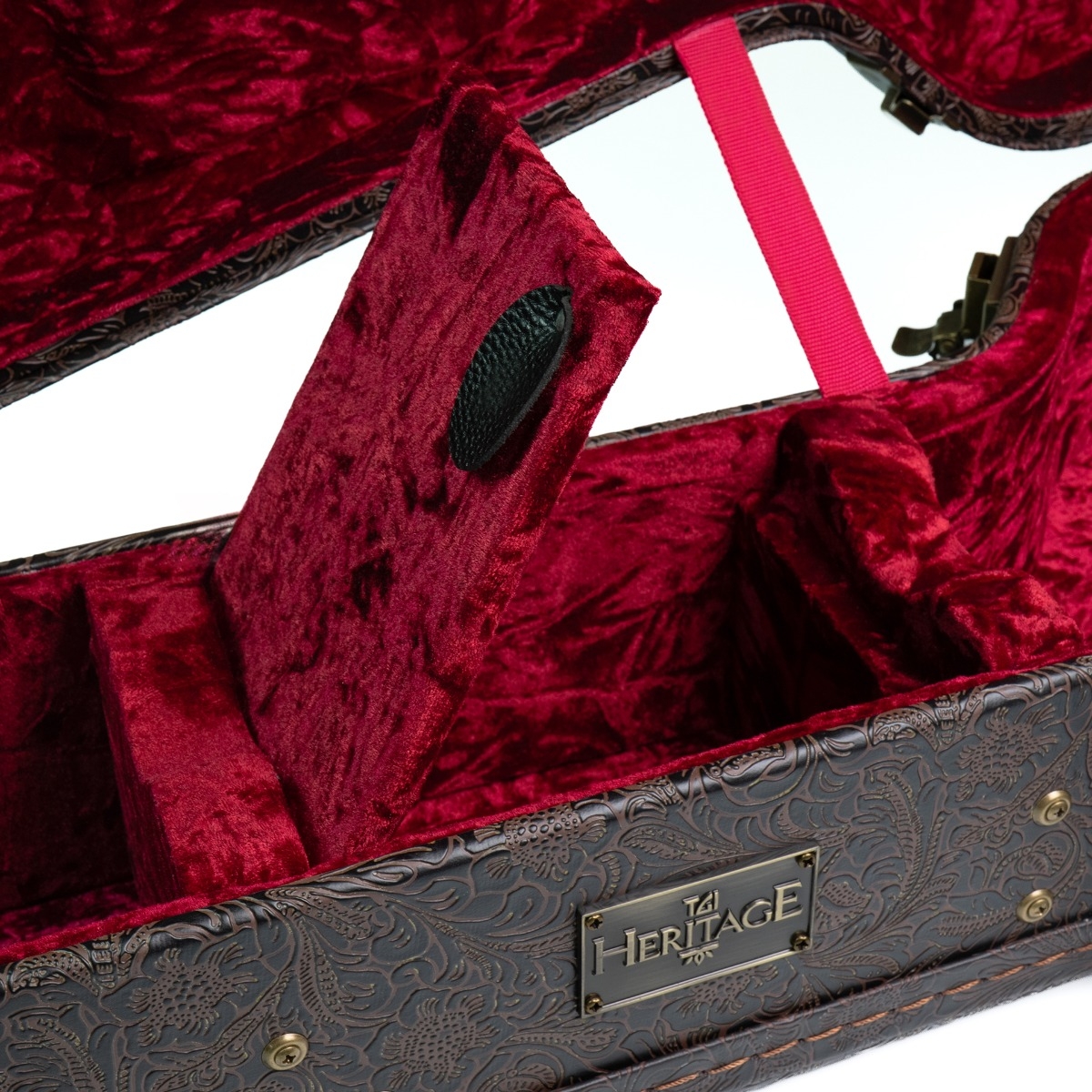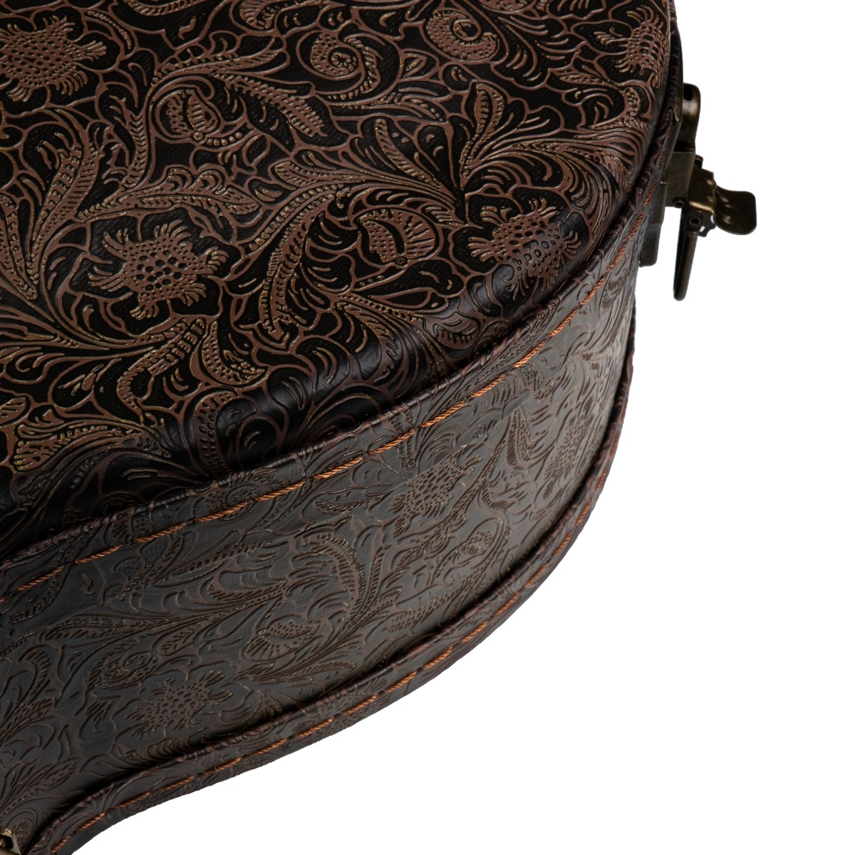 Visually, the Heritage case stands apart. The exterior is wrapped in an ornate embossed faux leather finish, featuring a detailed floral/petal pattern that evokes classic vintage luggage aesthetics. Gold-tone hardware - including secure latches and a locking clasp - adds both visual sophistication and practical security.